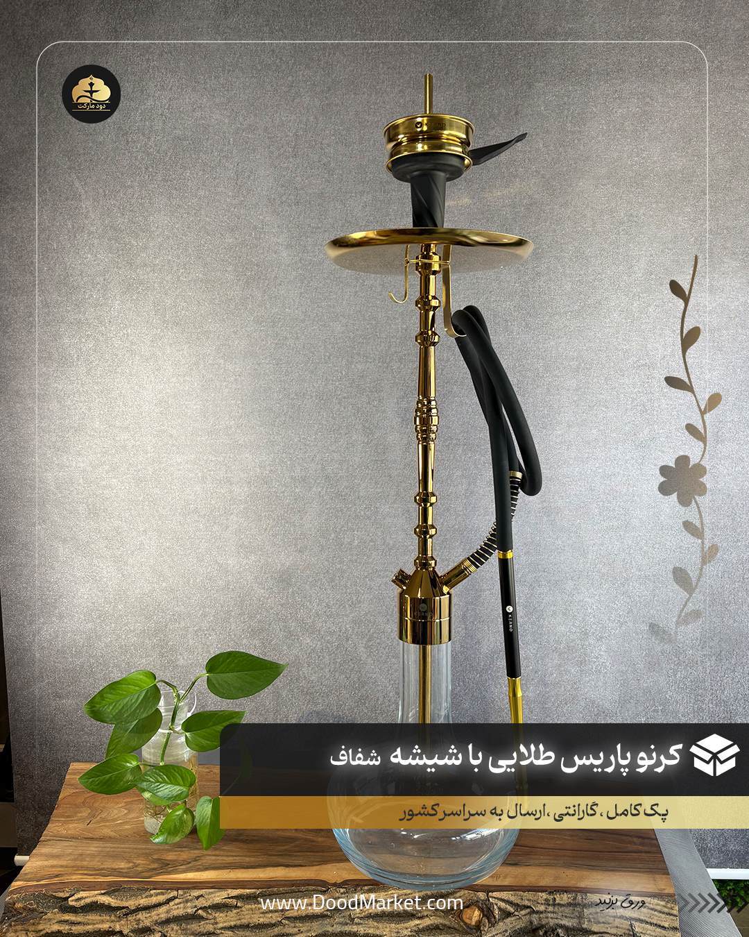 قلیان کرنو پاریس طلایی شیشه شفاف | خرید قلیان لوکس کرنو