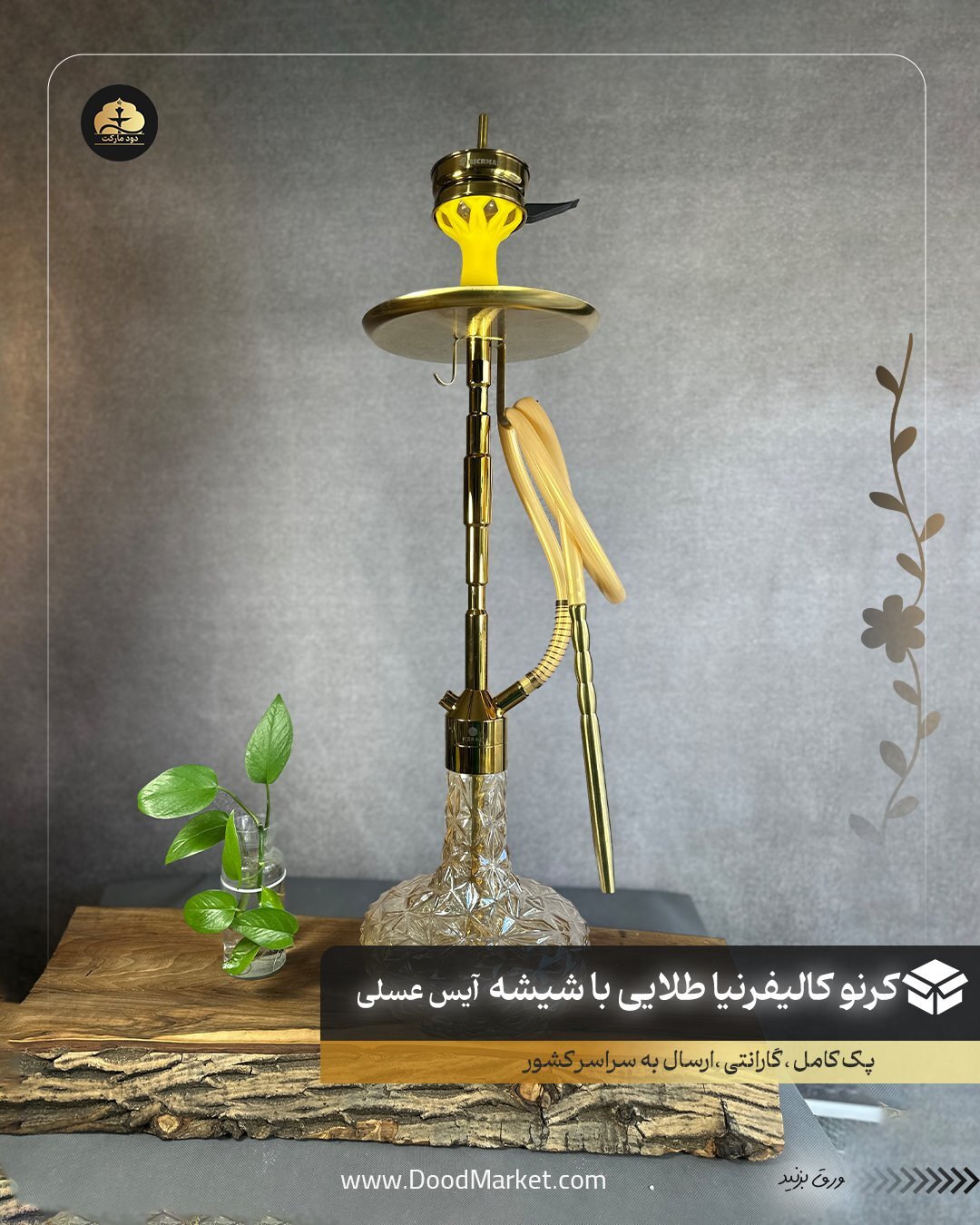 قلیان کرنو کالیفرنیا طلایی با شیشه آیس عسلی | { اصل + 3 سال گارانتی }